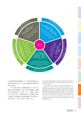 高端科研人才培养计划 以满足 High technology personnel training programme 公司经营结构调整为出发点 ,持续加强专业骨干和紧缺人才培训 To satisfy adjustments in the company’s operational structure, this programme aims to strengthen the professional backbone and to fill vacancies. 培训为重点,努力开 overseas staff. this programme provides training for To rapidly develop international integration, 好海外人员培训 以加速 国际化人才培养为方向,抓 Overseas human resources development programmes 海外人才发展计划